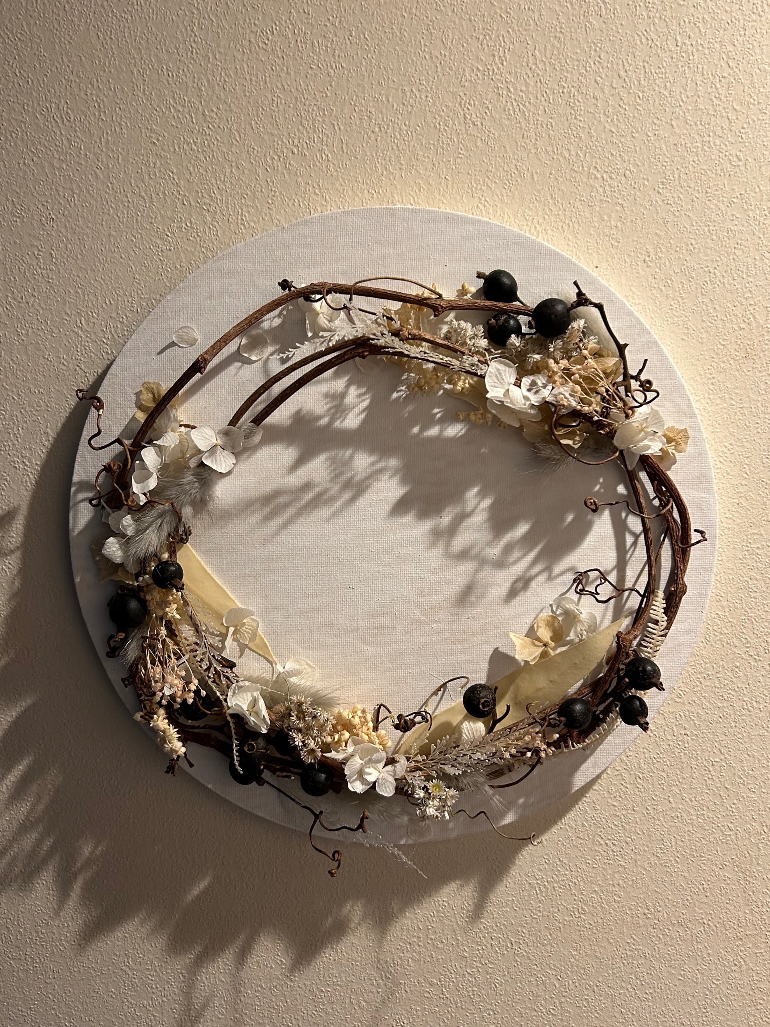 ・丸いキャンバスをカップの中のラテアートに見立て、プリザーブドフラワーやドライフラワーを用いて彩ったフラワーアレンジメント。